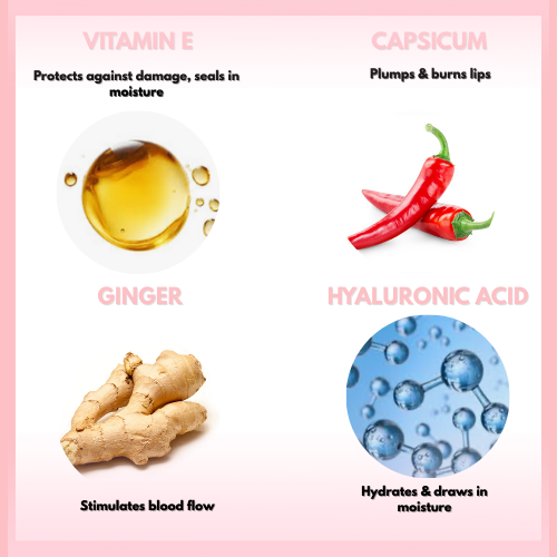 Ethylhexyl Palmitate, Octyldodecanol, Apple Fruit Oil, Dextrin Palmitate, Ginger Extract, Vanilla Butyl Ether, Capsicum Annuum Fruit Extract, Polyisobutene, Caprylic/Capric Triglyceride, Mineral Oil, Hyaluronic Acid, Cocos Nucifera (Coconut) Oil, Argan Oil, Butyrospermum Parkii (Shea Butter) Oil, Vitamin E, Parfum, Red 7 Lake(Ci 15850)